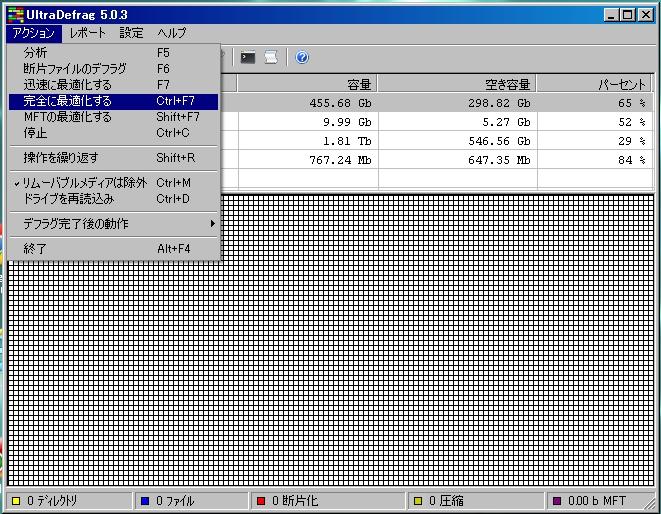 たいていこれで済みますが、どうしてディスクのフラグメントが激しそうだと思う場合、UltraDefragで「完全に最適化する」をしてあげれば、かなり動作が軽くなります。