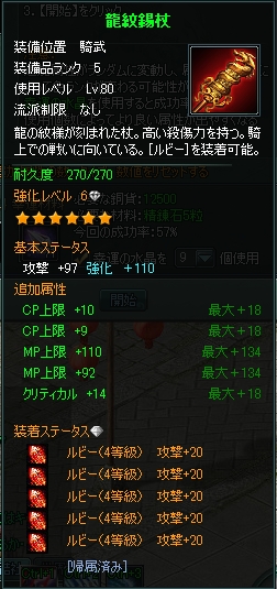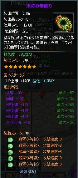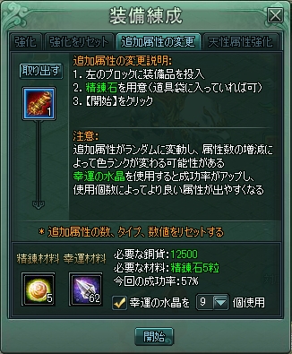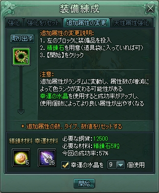 昨日のステータス画面の通り、紫になっていない装備が3ヶ所あって、何とも残念なので、なんとかならないものかと追加属性の変更をやってみましたw