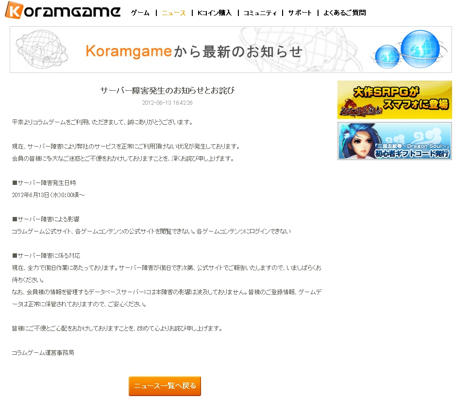 「なお、会員様の情報を管理するデータベースサーバーには本障害の影響は波及しておりません。皆様のご登録情報、ゲームデータは正常に保管されておりますので、ご安心ください。」ということは、アプリケーションサーバーのハードディスクが逝ったか?w